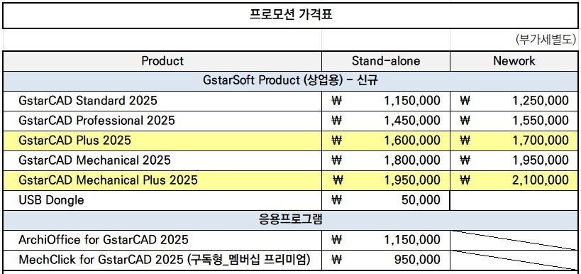 | ✅ GstarCAD 2025 제품 Standard, Professional, Plus, Mechanical, Mechanical Plus (모든 라이선스 타입 적용 가능 : Network, Stand-alone, 동글 USB) 💥 단, 동글USB는 동글 비용 (1개당 5만원) 발생됩니다. 💥 Mechanical, Mechanical Plus는 2026 무상 업그레이드 혜택 적용 안됨 ✅ 응용프로그램 아키오피스 (영구 라이선스), 멕클릭 (구독형_멤버십 프리미엄) 💥 멕클릭은 프로모션 제품이 영구 라이선스가 아닌 1년 구독형 라이선스임을 유의하여 주시기 바랍니다. (멕클릭 영구 라이선스 구매 시 1+1 ~ 5+5, 2+1 혜택은 적용되지 않음) |